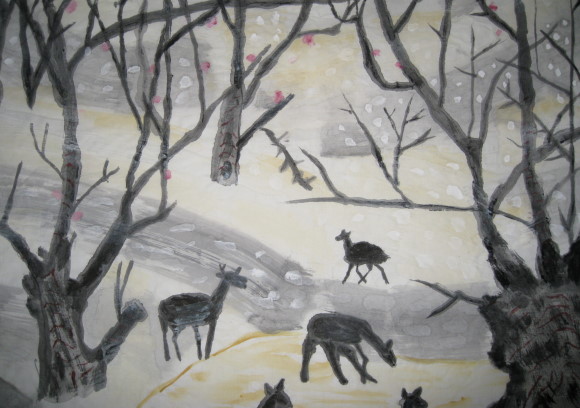 這是一幅我畫在棉紙上的水墨畫,有許多鹿在雪中吃草,鹿群悠閒的覓食著,
