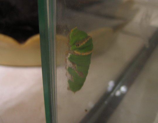 今天早上我發現牠真的開始化蛹了,而且牠的身體似乎縮小了一點,真期待看