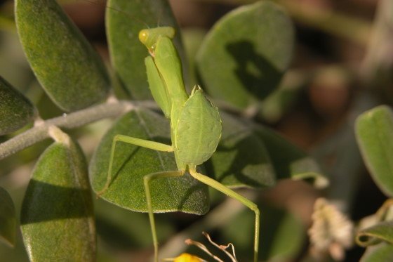 ,而是一隻螳螂的身體。牠把尾部翹得高高的,遠看還真像一片葉子。